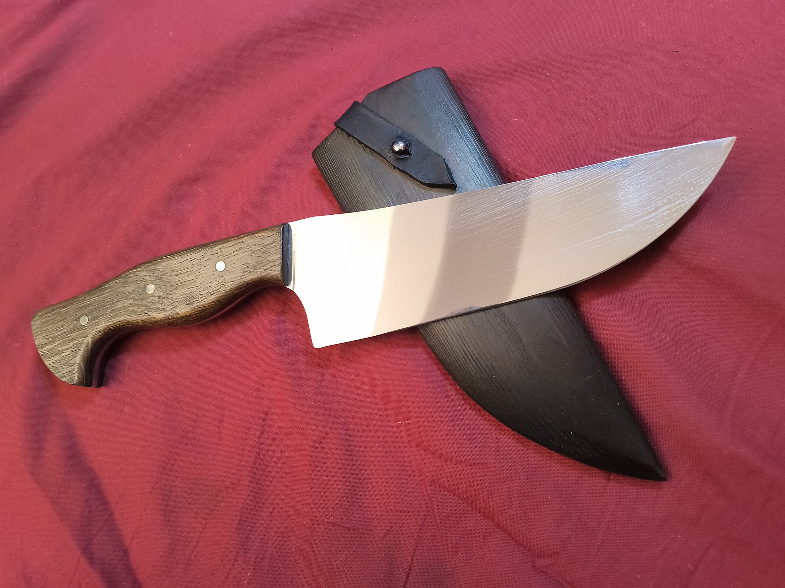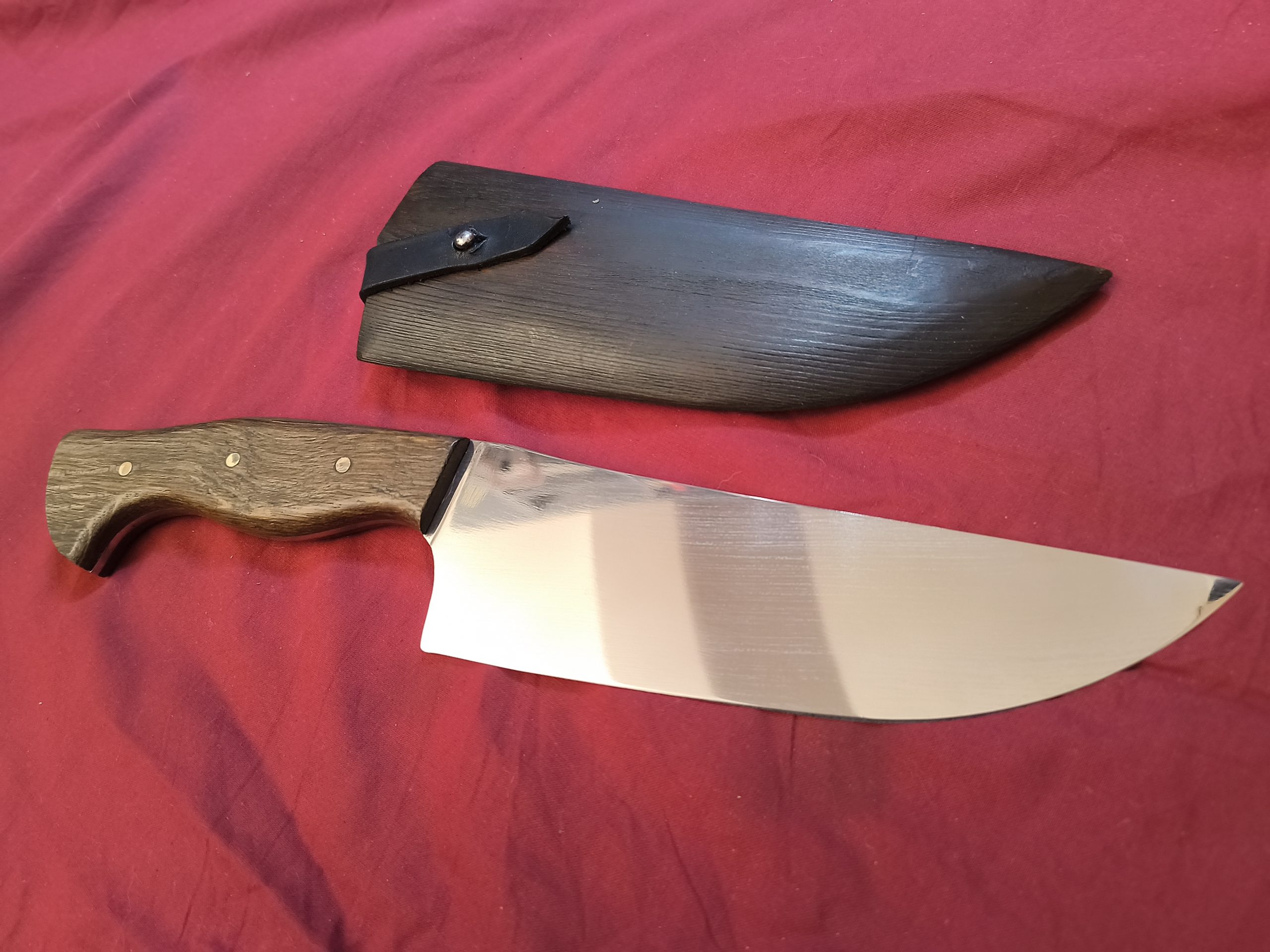 Cuchilla de cocina hecha a mano en acero al carbono SAE 1070, encabada con cachas de fresno y pasadores de latón. Pensada para el corte de carne (donde se luce de verdad), pero perfectamente cómoda para picar verdura y tareas generales de cocina.